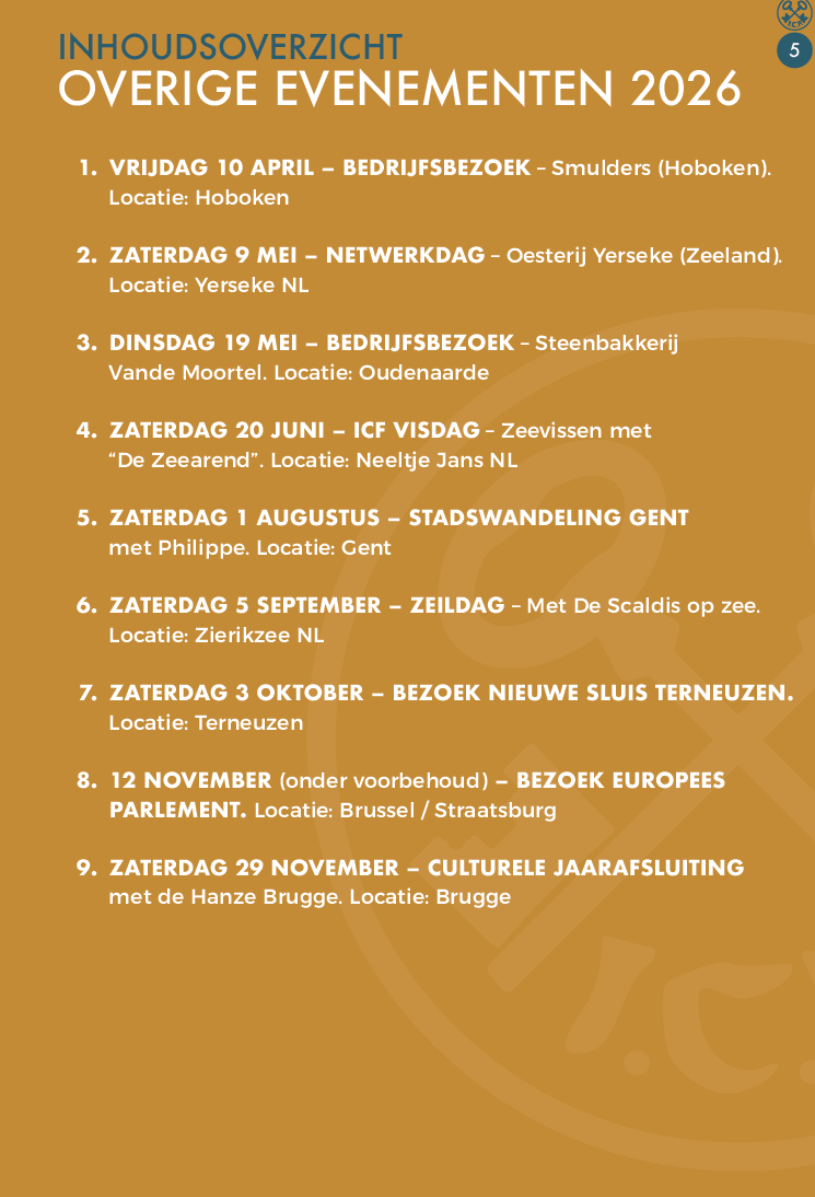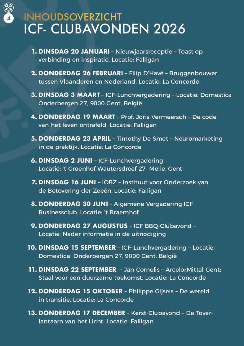 “Zee vol leven – Proef, voel en beleef de zee!”, met exclusieve network ICF‑dagen op en rond het water. Alle bijeenkomsten vinden plaats in een stijlvolle setting, met aandacht voor ontmoeting, inspiratie en verbinding.